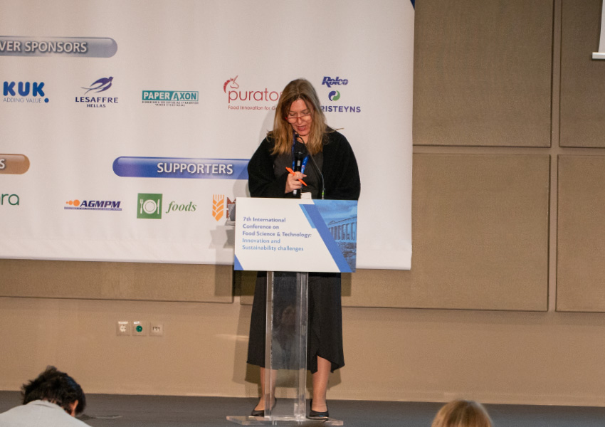 The conference began with the thematic session “Innovative Foods and Sustainable Development,” coordinated by Ms. Eleni Kalogianni. The first speaker to take the podium was Prof. Paola Pittia, Professor of Food Science and Technology at the Department of Biosciences and Technology for Food, Agriculture and Environment, and Vice-Rector for Internationalization at the University of Teramo in Italy. She spoke about innovation and sustainability as key drivers in the transition of food systems, emphasizing research and the development of scenarios and solutions for future food production.
